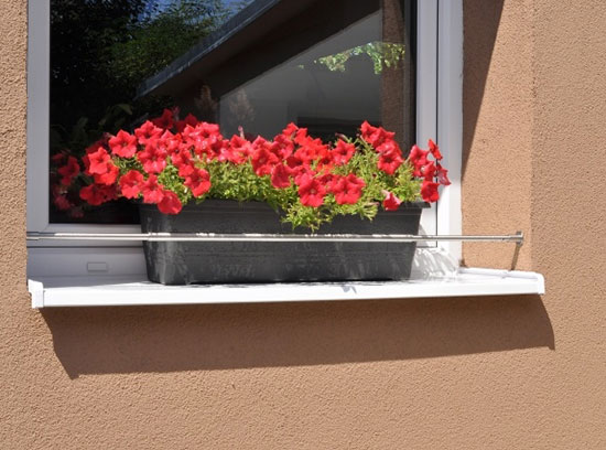 Nenápadné a praktické zábrany květinových truhlíků na okenních parapetech pro rodinné a panelové domy v nerezovém provedení. Pro celkovou šířku špalety 2100 - 2700 mm. Montáž bez vrtání, provádí se nastavením požadované délky zábrany a rozepřením. Součástí balení je kolíček k dotažení a bezpečnostní lanko.