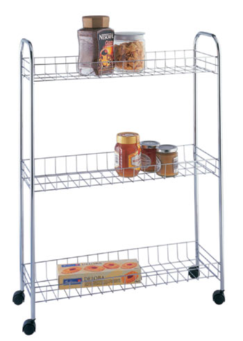 Úzký pojízdný kovový regál do úzkých prostor je svou konstrukcí vhodný do kuchyně, koupelny, prádelny atd. Pojízdný regál do úzkých prostor se vejde tam, kam nelze umístit nábytek běžných rozměrů. Kovový regál je vyroben z pochromovaných ocelových trubek a drátů. Regál má rozměry 84 x 56 cm, hloubka je 23 cm.