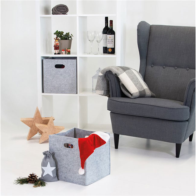 Úložný textilní box z filcu se 2 vysekávanými úchyty po stranách v trendy designu. Plstěný úložný skládací textilní box Filc lze použít pro snadné přenášení předmětů i jako prostorný organizér do čtvercových knihoven a polic.